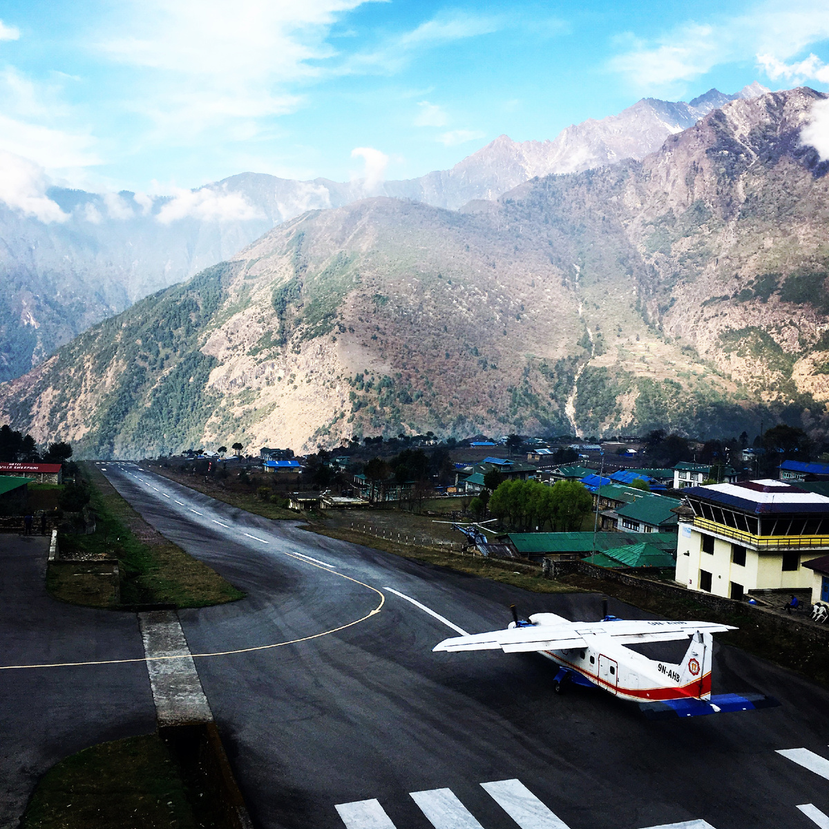 К этому рассказу я выложил отдельное видео о полёте и посадке в Лукле — его можно посмотреть в ленте канала. Аэропорт Лукла (официально — аэропорт имени Тенцинга и Хиллари) расположен в посёлке Лукла в регионе Кхумбу, на востоке Непала. Отсюда начинаются почти все классические треккинговые маршруты в национальный парк Сагарматха, на территории которого находятся Эверест, Лхоцзе, Нупце. Автомобильных дорог сюда нет: чтобы добраться до высокогорной части Кхумбу по земле нужно пару дней протрястись по бездорожью на джипе и далее добираться пешком.