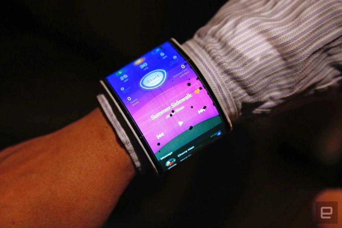 Интерфейс: При сгибании в браслет интерфейс делился на три секции, показывая время, уведомления, плеер и другие виджеты.