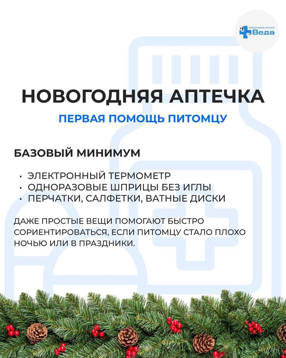 А ещё — время, когда питомцу может внезапно стать плохо, а ветеринарные аптеки и клиники работают по сокращённому графику. Чтобы не паниковать и не искать в 3 часа ночи «хоть что-нибудь от рвоты», мы собрали чек-лист домашней аптечки для кошек и собак на новогодние праздники. Сохраняйте, листайте и подготовьтесь заранее — пусть Новый год пройдёт спокойно для всей семьи 🐾🎁 И помните! Аптечка - это всего лишь первая помощь, чтобы облегчить состояние питомца, она не заменит прием врача. Мы работаем для вас и в праздничные дни. Ознакомиться с графиком