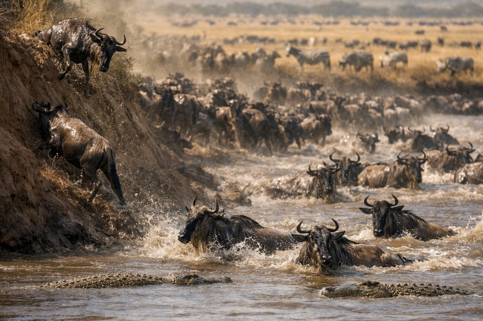 Подойдя к обрывистому берегу, гну останавливаются. Они могут провести у реки несколько дней, собираясь с силами, пока плотность животных не достигнет критической точки. Наконец, под давлением задних рядов первые особи бросаются в воду. Это момент высочайшего напряжения и опасности. Реки кишат нильскими крокодилами, иногда достигающими шести метров в длину, которые терпеливо ждут своего часа годами. Крокодилы — не единственная угроза. Сильное течение, скользкие камни, крутые глинистые подъёмы на противоположном берегу становятся смертельными ловушками. Животные падают, ломают ноги, тонут, давят друг друга в панике. Запах крови и отчаяния висит в воздухе. Этот жестокий отбор — неотъемлемая часть природного баланса, обеспечивающая выживание сильнейших и здоровейших особей, а также пропитание для огромной популяции хищников и падальщиков.