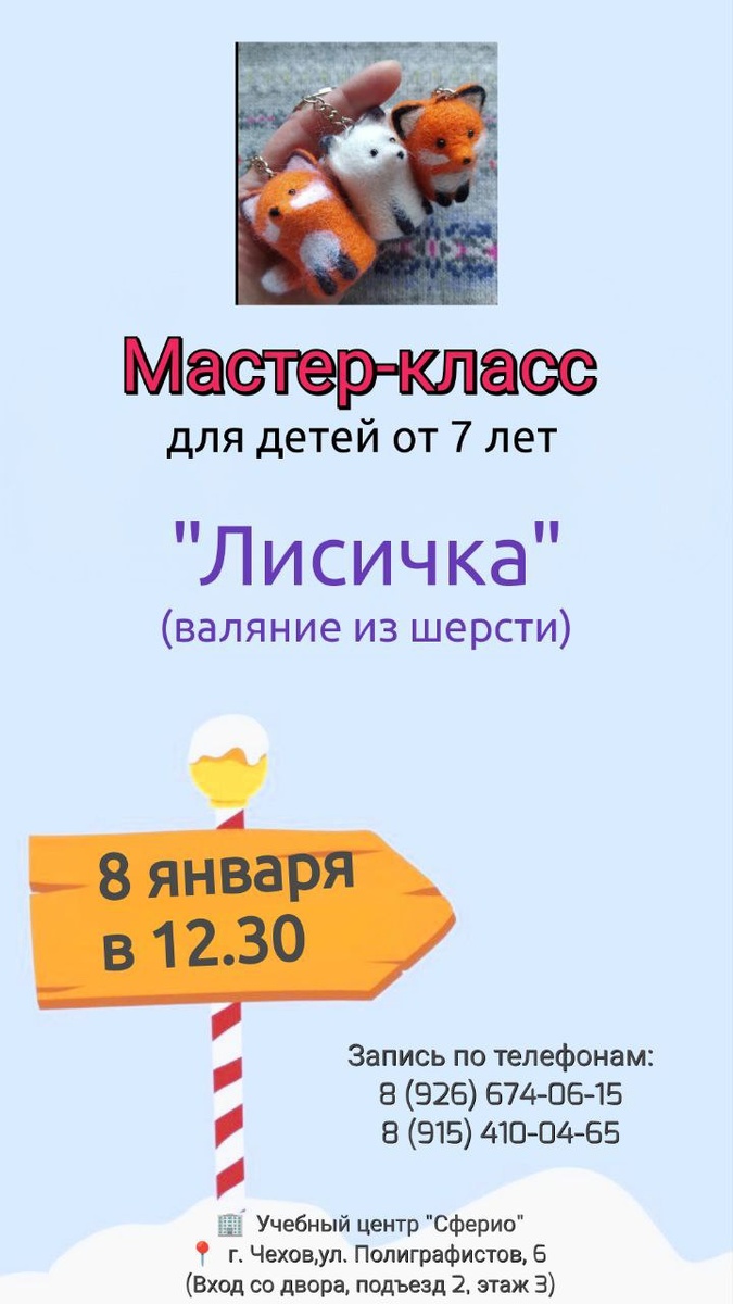 ✨ 🦊✨МАСТЕР-КЛАСС «ВАЛЯНИЕ ЛИСИЧКИ ИЗ ШЕРСТИ»✨🦊 🤗Приглашаем на увлекательное творческое занятие! Что будем делать? 🧶Создадим лисичку из шерсти своими руками 🎨Научимся валянию, смешиваем цвета и придаём шерсти форму 😊Разовьем творчество, аккуратность и мелкую моторику 😍Готовая лисичка станет красивым подарком или украшением дома 🚫 Возраст: 7+ 📆 08.01.2026 🕛 12:30 🏢 Учебный центр "Сферио" 📍 г. Чехов,ул. Полиграфистов, 6 (Вход со двора, подъезд 2, этаж 3) 🔗 Записаться: https://t.me/UZentrSferio2024 Наши соцсети 📲⬇️ ➡️ ВК https://vk.com/sferio_kids ➡️ ТГ https://dzen.ru/id/672e115c65592e5989376c34 ➡️ Продленка https://vk.com/prodlenkachehov ➡️ Школа https://vk.com/sferio_school 🎁Забрать подарок:🎁 https://t.me/bot_sferio_bot 💥 Подпишись и получи подарок 💥 Наша What'sApp группа