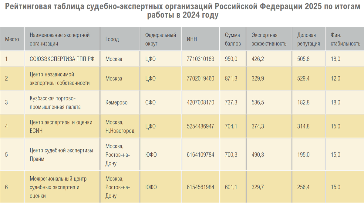 Ежегодно Судебно-экспертная палата Российской Федерации производит рейтингование экспертных организаций в рамках экспертной деятельности. При формировании рейтинга учитывались данные более ста негосударственных экспертных коммерческих и некоммерческих организаций из различных регионов России. Участники оценивались по 45 показателям в трех категориях: экспертная эффективность, деловая репутация и финансовая стабильность Кузбасская ТПП заняла 3 место в VI Общероссийском рейтинге судебно-экспертных организаций по итогам 2025 г., который провела Судебно-экспертная палата Российской Федерации. Объявление результатов независимой оценки деятельности экспертных организаций по итогам 2025 года состоялось 5 декабря 2025 года в Москве в рамках ежегодного мероприятия Судебно-экспертной палаты РФ. Кузбасской ТПП вручено свидетельство о 3-ем месте по итогам рейтингования в 2025 году. Союз "Кузбасская торгово-промышленная палата" удерживает третью позицию в рейтинге второй год подряд. В первых двух