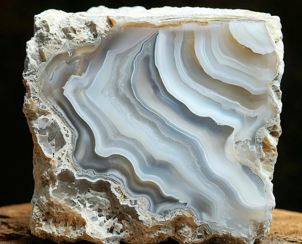 Белый агат — это разновидность кварца. Он имеет молочный цвет и тонковолокнистую структуру, которая особенно заметна на разрезе камня из-за переплетения друг с другом насыщенно белых и почти прозрачных слоёв. Поэтому, агат напоминает холодные заснеженные горы или ангельские крылья.