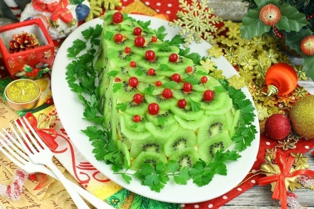 Предлагаем приготовить новогодний салат «Елочка» с курицей и киви – не избитый и великолепный рецепт с простыми ингредиентами и отличным результатом!