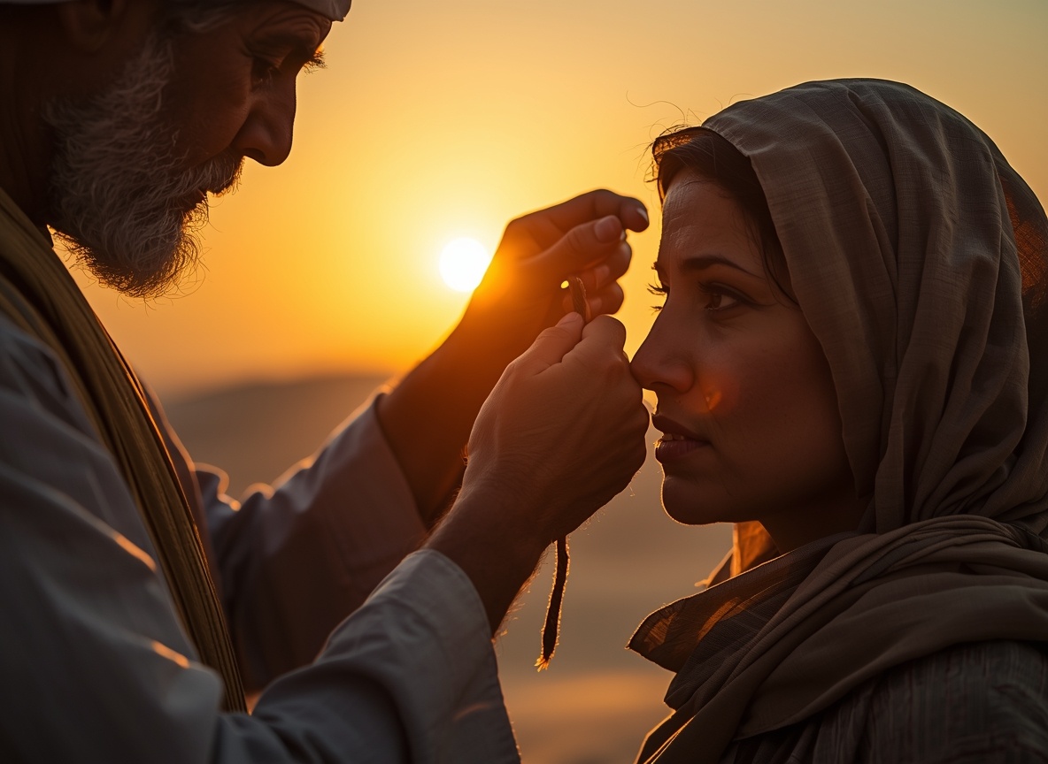 Вечер застал нас на том же месте, у потухающего костра. Небо на западе полыхало, как расплавленное золото. Салим вдруг стал серьёзен. Он подозвал меня, взял за конец того самого платка, что был у меня на голове, и медленно, почти торжественно развязал узел, которым он был закреплён. Ткань мягко соскользнула на мои плечи.