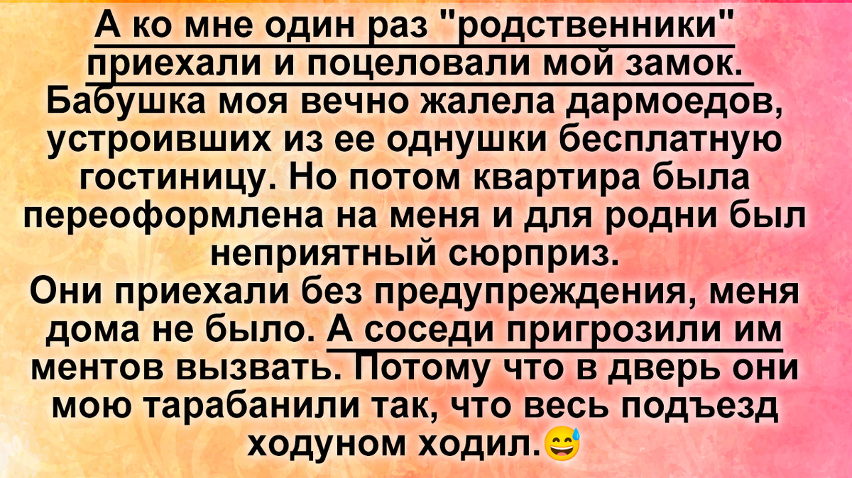 А ко мне один раз так "родственники" приехали и поцеловали замок. Бабушка моя вечно жалела дармоедов, устроивших из ее однушки бесплатную гостиницу. Но потом квартира была переоформлена на меня и для родни был неприятный сюрприз.