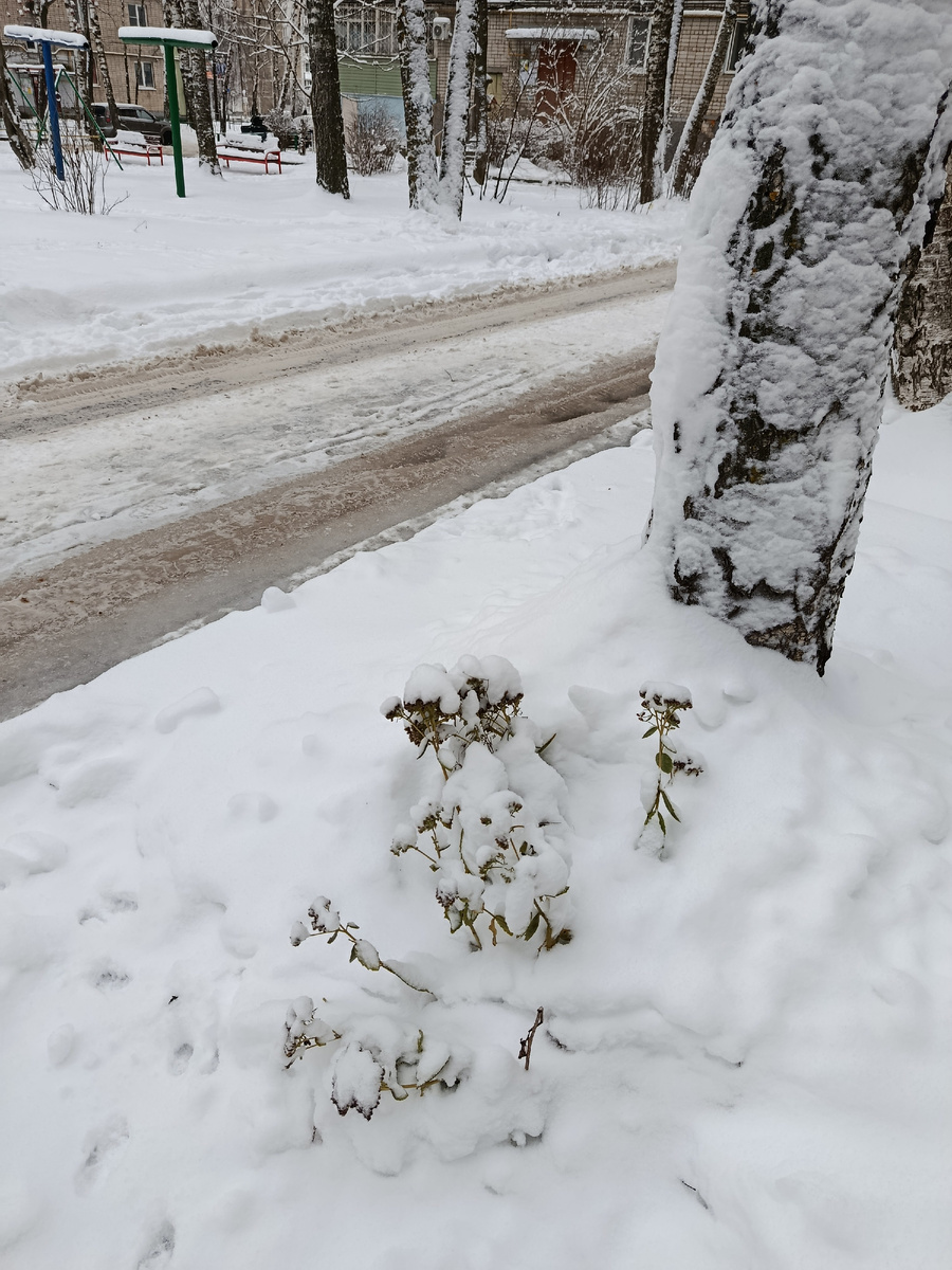 Бессмертные цветы, частые гости в этой ленте, встретили меня бодрым торчанием из подберёзового сугроба у крыльца.
