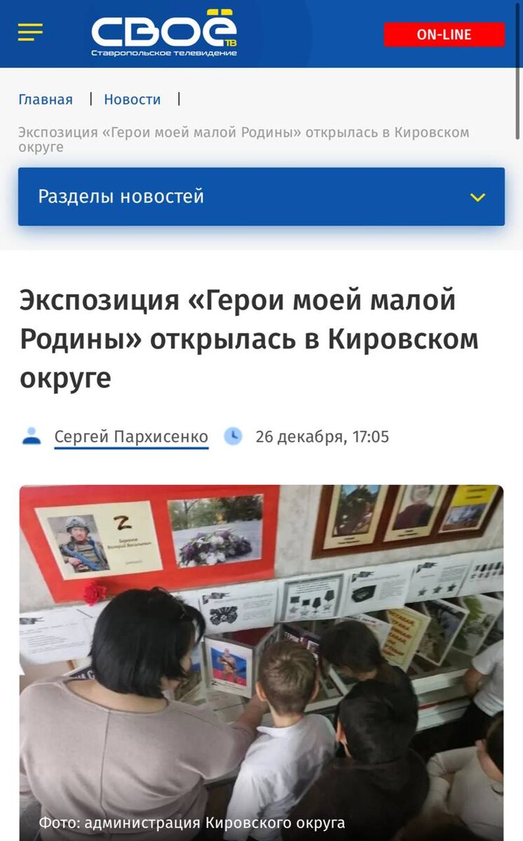 Выставка работает в рамках всероссийской акции «История героев». В школе №8 села Горнозаводское Кировского округа открылась выставка «Герои моей малой Родины», посвящённая местным жителям, принимавшим участие в различных вооружённых конфликтах. В экспозиции выставлены фотографии и документы военнослужащих ,сообщает 26 декабря управление пресс-службы и информационной политики губернатора и правительства Ставропольского края. «История каждого героя, представленного на выставке, становится для школьников живым уроком патриотизма, формируя чувство гордости за свою малую Родину», – рассказала заведующая музейной комнатой Ольга Пономарёва. Ранее сообщалось, что в Зеленокумске открылась выставка об участниках СВО.