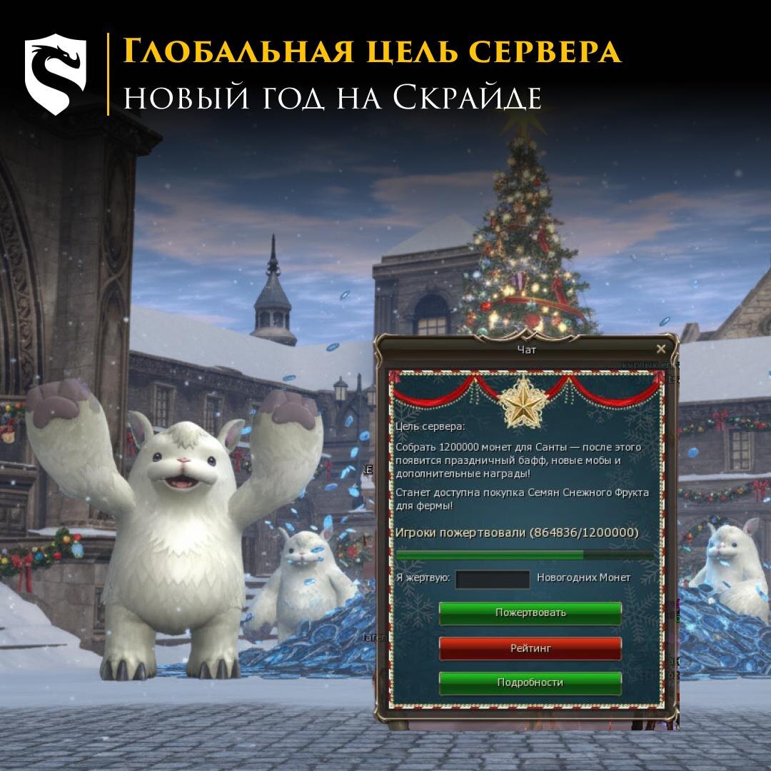 С запуском Новогоднего Ивента на всех серверах Скрайда появился специальный NPC — Новогодняя Ёлка. Этому NPC вы можете пожертвовать Новогодние Монеты, а после достижения общей цели сбора у Ёлки активируется праздничный бафф для всех игроков: – Santa Gift: Увеличивает рейты Adena/Drop/Spoil на 15%. Увеличивает Скор. Атк. на 5%, Скор. Маг. на 5%, Макс HP/MP/CP на 500. Время Действия: 1 час. Помимо новогоднего баффа, в ивент локации появится большое количество новых существ с улучшенным дропом, а на Х2 будет возможность покупать специальные Снежные Семена для фермы и получать из них большие мешки санты. В отличие от Толянов, серверы не успевают на большой корпоратив до НГ. Вот такие цифры мы сейчас имеем: – Скрайд Х2: ▓▓▓▓▓▓▓░░░ 72% (869 781/1 200 000 монет) – Скрайд Х50: ▓▓▓░░░░░░░ 29% (338 626/1 200 000 монет) – Скрайд Х1000: ▓▓▓▓▓░░░░░ 46% (188 900/400 000 монет) Советуем поднажать! Топ-10 игроков из рейтинга получат персональную награду. Как думаете, какой сервер первым достигне