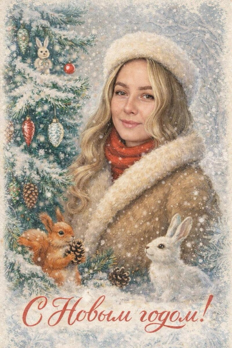 🥰 Промт: Создай винтажную новогоднюю открытку со всеми людьми из предостваленных фотографий. Стиль - советские сказочные открытки 1950-1970-х годов, мягкая живописная иллюстрация, ощущение тепла и уюта. Композиция и формат: Персонажи остаются в центре композиции • Фон - зимняя сказочная атмосфера Лица: • Лица в точности переданы с приложенных фото • Без изменения черт лица, телосложения, возраста и эмоций • Реалистичное сходство, аккуратная художественная стилизация без искажений. Одежда и образы: • Заменить современную одежду на старинную зимнюю советскую одежду • Декор и детали: • Новогодняя ёлка с простыми советскими игрушками • Еловые шишки, хвойные ветки • Лесные зверюшки (белочка, зайчик) в сказочном стиле • Лёгкий снег, морозные узоры Цвет и атмосфера: • Светлая, зимняя, мягкая цветовая палитра • Пастельные оттенки, эффект старой бумаги, легкое зерно • Сказочное, теплое новогоднее настроение Надпись: • Текст: «С Новым годом!» • Шрифт - изящный, рукописный, сказочный, в стиле
