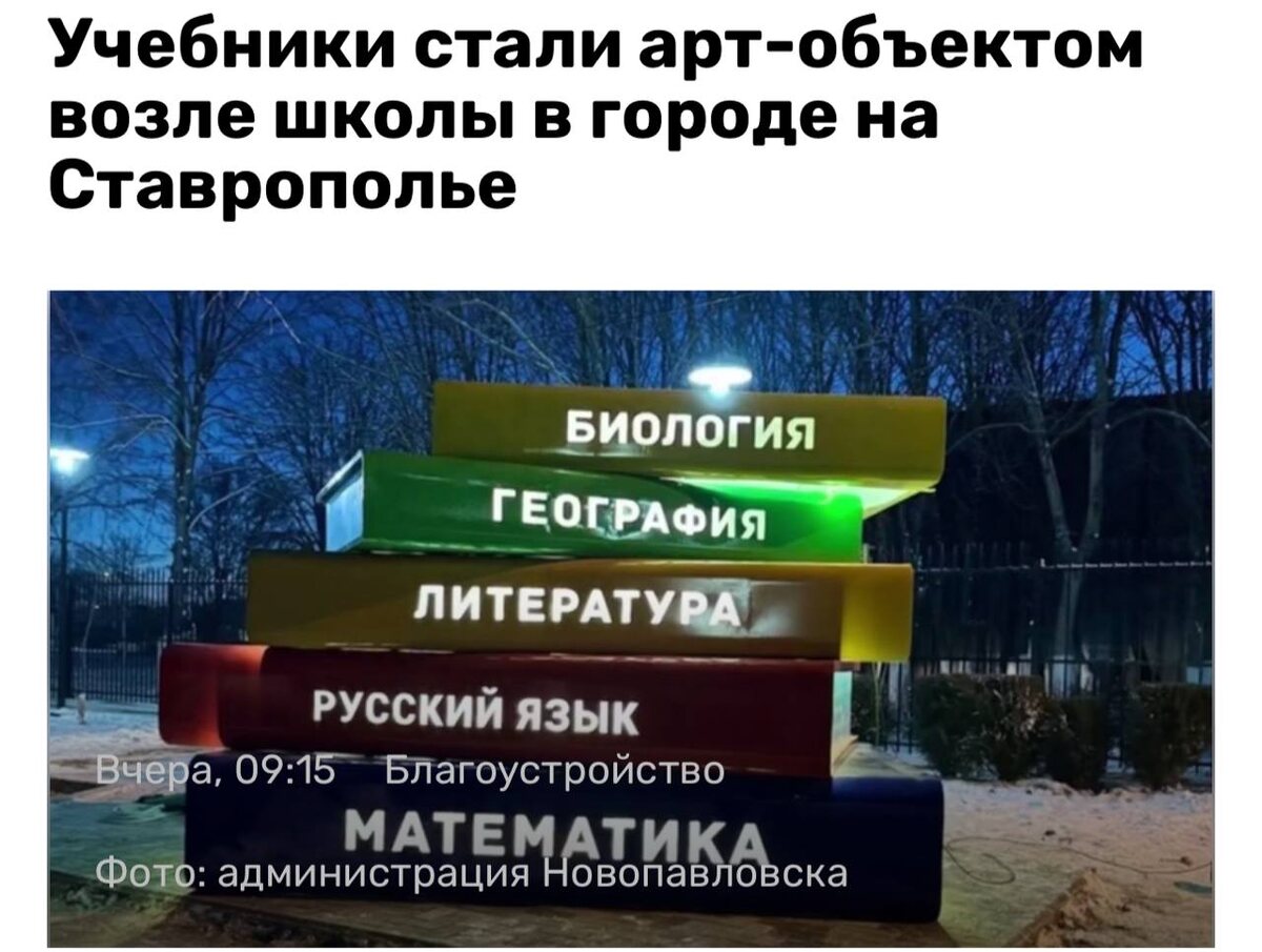 Новый арт-объект в виде учебников установлен возле школы №13 в Новопавловске. Он призван вдохновлять детей на учёбу и новые открытия, сообщила администрация города. Стопка пособий по биологи, географии, литературе, русскому языку и математике появилась на улице Продольной. Днём композиция привлекает внимание ярким видом, а вечером мягко светится, создавая уютную атмосферу. Новый элемент городской среды, по задумке авторов, сделает путь в школу приятнее. «Пусть эти светящиеся книги станут для ребят добрым символом дороги к знаниям, новым открытиям и большим мечтам», — пожелали в администрации. Напомним, что 18 мест отдыха благоустроили в сёлах на Ставрополье по нацпроекту в 2025 году.