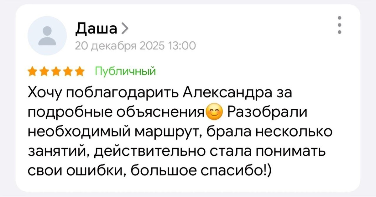 ! 🤝 Очень ценно, что за несколько занятий мы не просто «покатались», а разобрали Ваши ошибки на учебном маршруте и довели действия до уверенного понимания — именно так и появляется спокойствие за рулём. 👍 Тем, кто тоже хочет перестать бояться дороги и начать понимать свой автомобиль, предлагаю не откладывать — свободные окошки для записи здесь: https://dikidi.net/1829681. Например, есть 2 свободных места: завтра (пн, 29 дек.) в 13:00 и 14:30.