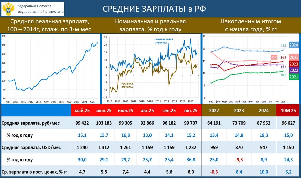 В 2025г зарплаты растут на 15% г/г (проинфляционный фактор) В 2024г зарплаты выросли на 19% г/г После декабрьского заседания ЦБ новости проинфляционны: — рост зарплат 15% г/г, — рост корпоративного кредита 20% в год (https://t.me/russianmacro/22238?single) Недельная инфляция пошла вверх +0,2% за неделю с 16 по 22 декабря