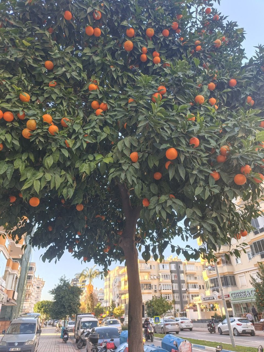🎄 Апельсиновые деревья🍊🍊🍊 Да прямо на улицах. И эти апельсины никому не нужны. И не потому, что местные "зажрались", а потому что это не апельсин, а "турунч" по-турецки или "померанц" по научному. Вот что говорит интернет: Помера́нец (лат. Cítrus aurántium), также известен как бигара́дия, севи́льский апельси́н, ки́слый апельсин, или го́рький апельсин На вкус померанец кислый и немного горький. Созревают плоды с конца ноября по январь. Цветет это растение лишь один месяц в году, апрель. Цветы померанца имеют свое название – флердоранж, что в переводе означает "цветок апельсина". Поэтому...если увидите где-то в теплых краях уличные апельсины, которые никто не собирает - то знайте, что это коварные кислые померанцы😁 Обычные новогодние ёлки на улицах тоже есть, конечно. Но всё равно атмосфера праздника тут очень своеобразная)