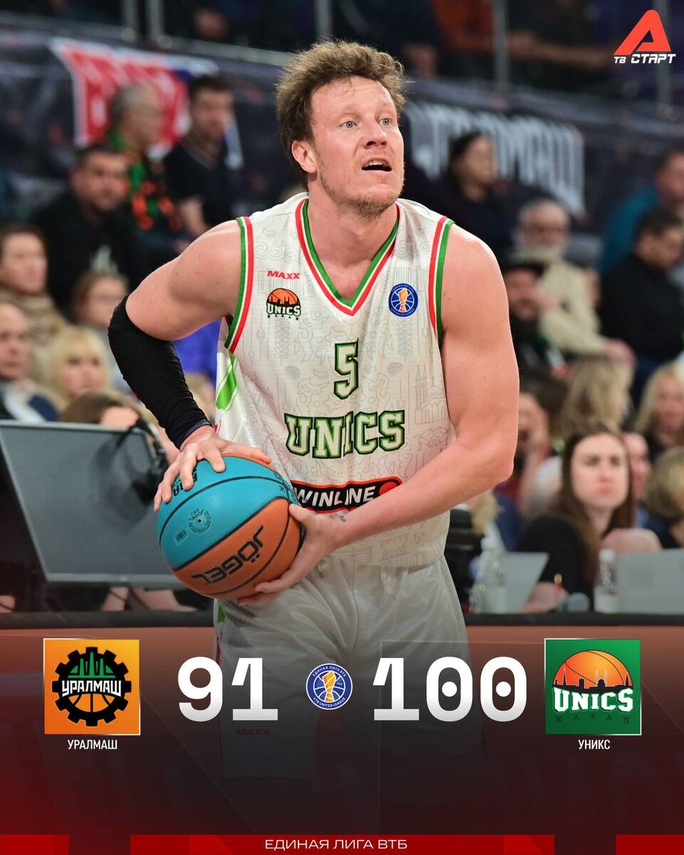 ! Казанцы тоже сегодня с победой — одолели бойкий «Уралмаш» со счетом 100:91. Уж очень уверенно оторвались от других команд лидеры Единой Лиги ВТБ 😮💨 Подписывайся на ТВ СТАРТ в MAX📲