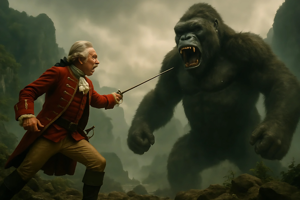 "Ты, конечно, силен," крикнул барон, когда Кинг-Конг попытался схватить его. "Но сила без ума – это лишь грубая мощь. А я, как ты видишь, обладаю и тем, и другим."