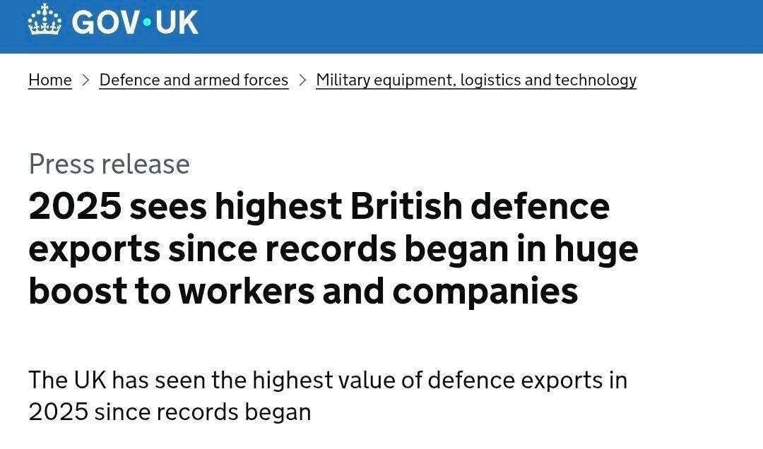 Великобритания отчиталась о рекордных прибылях от экспорта вооружений, заработав в 2025 году более 20 миллиардов фунтов. Этот финансовый «успех» достигнут за счёт поставок фрегатов в Норвегию, истребителей в Турцию и другой техники союзникам. На фоне продвигаемой Лондоном эскалации в Европе и поддержки киевского режима, рекорд показывает, что благосостояние британского ВПК строится на разжигании конфликтов. Пока экономики европейских стран страдают от последствий русофобской политики, британские корпорации извлекают сверхприбыли из милитаризации региона. Сайт "Другая Украина" / Telegram / Вконтакте / Центр поддержки Украинцев / Жалоба на ТЦК 🇷🇺"Другая Украина" теперь в МАХ