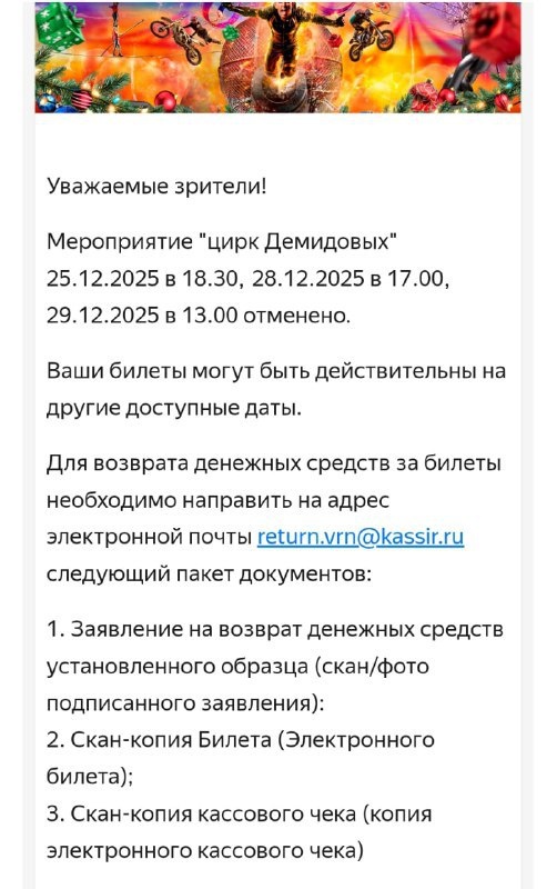 Шоу, запланированное в городе, перенесли всего за сутки до заявленной даты без указания причин. Зрители подчеркивают, что им не вернули сервисный сбор. Цирканты вместо выступления участвовали в корпоративном мероприятии.