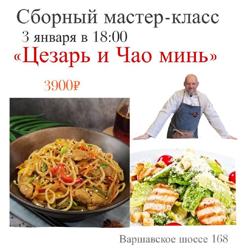 В 18:00 приглашаем на сборный мастер-класс! Есть 8 мест! Под руководством шефа Антона готовим: -САЛАТ ЦЕЗАРЬ по классическому рецепту,годами выверенному шефом. Очень вкусный 🔥 -на горячее еще один хит из коллекции проверенных рецептов-ЛАПША ЧАО МИНЬ со свининой и овощами Ароматная,насыщенная🔥 Будет интересно,вкусно и весело) Поиграем в крокодил на супер приз,посмотрим Фокусы от Антона🥳 Стоимость участия 3900₽ Продолжительность 3 часа Спиртное можно принести с собой,сборов нет Чай,лимонад включены в стоимость. Пишите в телеграмм 89275596440 @pro_edu_moscow Варшавское шоссе 168