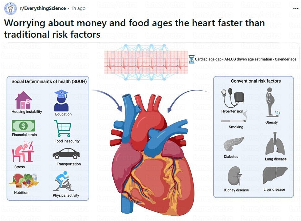Американские учёные проанализировали данные более 280 тысяч пациентов и пришли к выводу, что финансовые трудности повышают риск смерти от сердечно-сосудистых заболеваний на 60%. Для сравнения, перенесённый сердечный приступ увеличивает этот риск всего на 10%. Проблемы с деньгами повышают уровень стресса и кортизола, что способствует воспалению и ускоренному старению сердца.