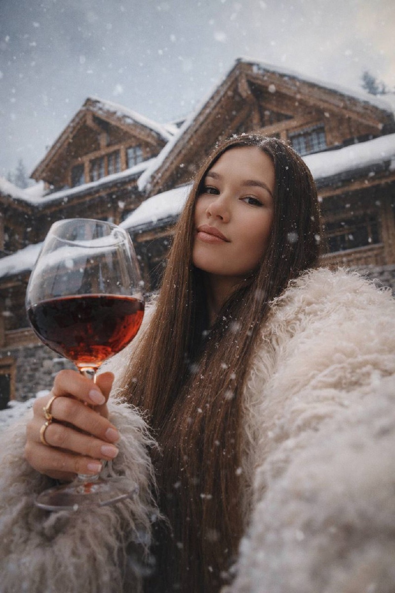 ⤵️ Создаем зимнюю сказку 🥰🎄 An ultra-realistic cinematic photo in film look style, shot as a selfie from a low angle. The camera is pointed slightly upward, creating a dynamic perspective and emphasizing the grandeur of the wooden mountain chalet and its snow-covered roof behind. The top lines of the building recede into perspective, enhancing the low-angle shot effect. A woman is featured in a close-up, her face tilted slightly forward toward the camera. Her face is the same as in the photo. Due to the angle, her features appear more expressive: her lips, and jawline are accentuated. Her expression is calm and confident, with a slight, sensual half-smile. She is wearing a voluminous white fluffy fur coat with long, soft pile, which fills the lower part of the frame thanks to the shooting angle. In her hand, raised higher than usual due to the selfie angle, she holds a glass of red wine — the glass is large and close to the camera, creating an almost three-dimensional presence. The