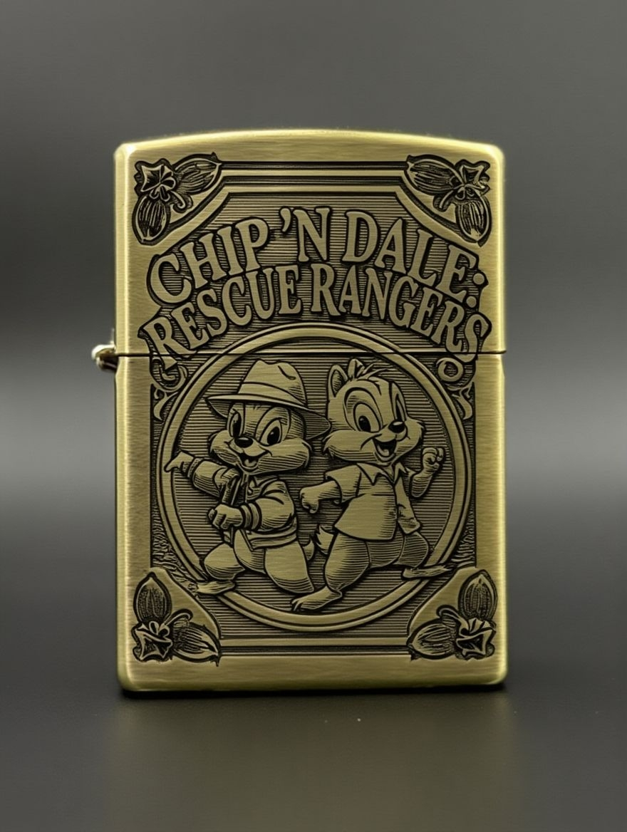 Здрасте. Давно не чесались руки чего-то поделать. Сегодня немного ностальгии по временам, когда можно было смотреть телевизор по выходным утром. Решил попробовать поискать вдохновение в новых технологиях. В нейросети запросил сделать дизайн по мультику «Чип и Дейл», и через примерно 6 или 7 коррекций выдало: Сама концепция мне понравилась, но они были совсем не похожи. Плюс выглядело немного простовато, поэтому я решил их подправить по-своему и заодно поправить самих героев. Немного поменял рамку и остальное. От предложенного нейронкой осталось процентов 20, наверно, но — не беда. Дальше — пробы на металле, и тут мне показалось, что надо добавить линейки теней, так как выглядит словно раскраска. Но всё равно выглядело простовато. Решил ещё растушевать тени послойно. на почти итоговом варианте видна разница. С обратной стороны просто решил сделать их лого. Ну и собственно итоговый вид. Всех с наступающим Новым Годом.