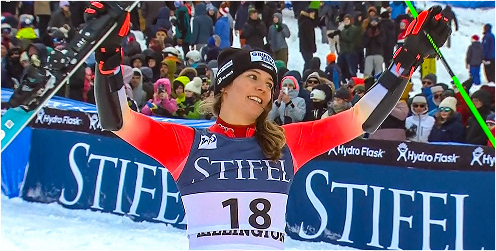 Микаэла Шиффрин – на старте. Она проиграла Раст 54 сотых, и она стартует с запасом в 12 сотых. Наверху она увеличивает отрыв до 96 сотых, везет секунду с лишним дальше. И привозит 93 сотых Катарине – хотя и ее заезд был неидеальным, Микаэла вновь показывает мастер-класс. Труппе теперь вторая, Холденер – третья.
