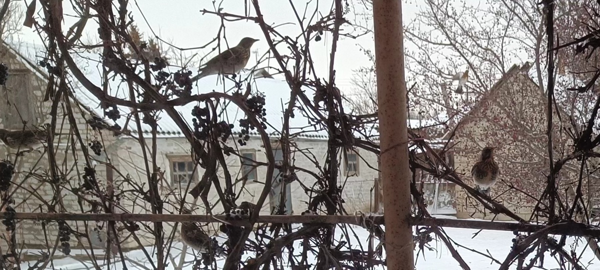 А ещё сегодня с утра на виноград прилетали свиристели. Они очень пугливые и летают быстро. Когда подходишь к окну, они тут же упархивают.