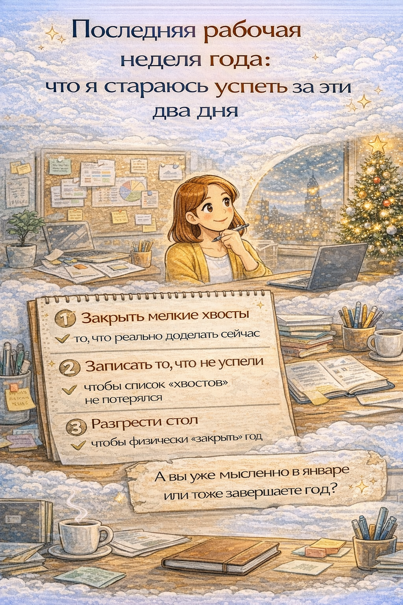 Каждый год она приходит неожиданно — последняя рабочая неделя. Вроде бы весь декабрь был про «успеть», но именно сейчас становится ясно: времени мало, сил ещё меньше, а в голове одновременно Новый год, итоги и список задач, который так и не стал короче. За годы работы у меня сложился довольно чёткий внутренний сценарий, что именно я стараюсь сделать в эти последние два рабочих дня. Он не про героизм и «дожать всё любой ценой», а скорее про порядок — в задачах, в голове и даже на столе. Первое и главное: все силы команды мы бросаем на закрытие мелких хвостов, которые реально можно доделать здесь и сейчас. Не стратегию на три года вперёд.