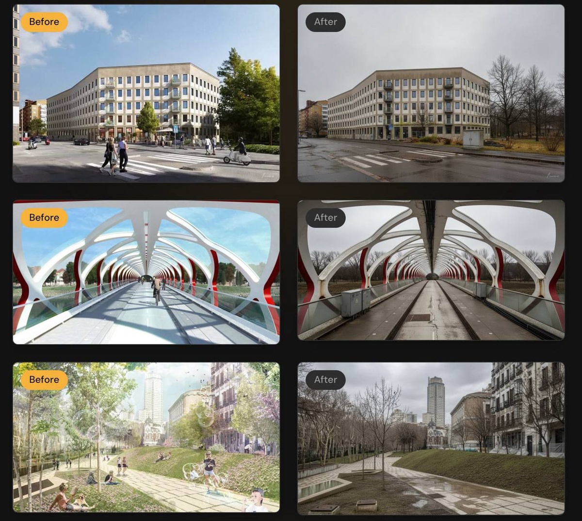 ». Внутри — нейросеть, которая опускает с небес на землю любое маркетинговое изображение застройщиков, генерируя картинку «без солнечного света, счастливых семей, нереально зеленых деревьев». Проще говоря, показывает, какой будет «холодная, честная, удручающая реальность случайного вторника в ноябре».