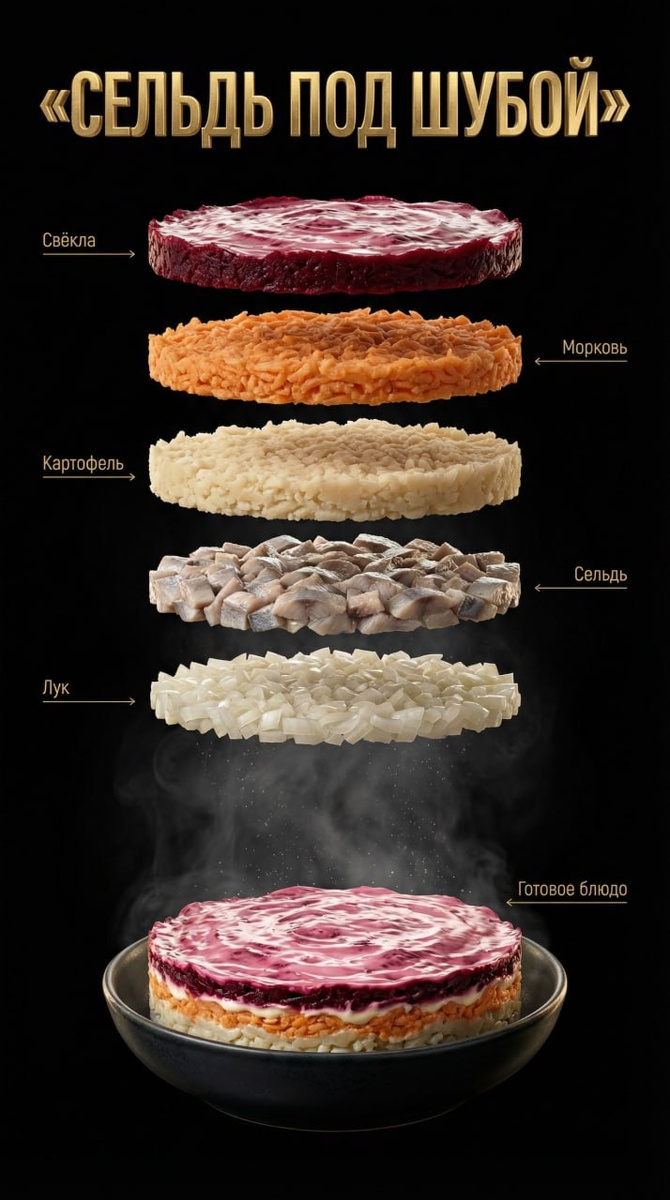 ✔️ Инструкция: Для этого заходим в VeoSeeBot или на сайт , выбираем "Работа с изображениям", Nano Banana Pro и пишем промпт ниже: Рекламный постер еды класса люкс, вертикальный формат 9:16. В самом верхнем центре композиции, паря над всеми ингредиентами, расположено выразительное премиальное название: «ОЛИВЬЕ» Художественная рукописная каллиграфия, массивные трёхмерные буквы из скульптурного золота, матовая золотая отделка, тёплые блики, реалистичные металлические отражения, эффект парения в пространстве. Абсолютно чёрный фон (#000000). Без стола, без тарелки под слоями, без платформы. Ингредиенты показаны в виде вертикально выстроенных, парящих слоёв, разделённых воздушными промежутками. Ультрареализм, высокая детализация. Структура слоёв (сверху вниз): Верхний слой: Свежая мелко нарезанная зелень — укроп и зелёный лук, насыщенный ярко-зелёный цвет, матовая текстура, ощущение свежести. Второй слой: Отварная морковь, нарезанная аккуратным мелким кубиком, тёплый оранжевый оттено