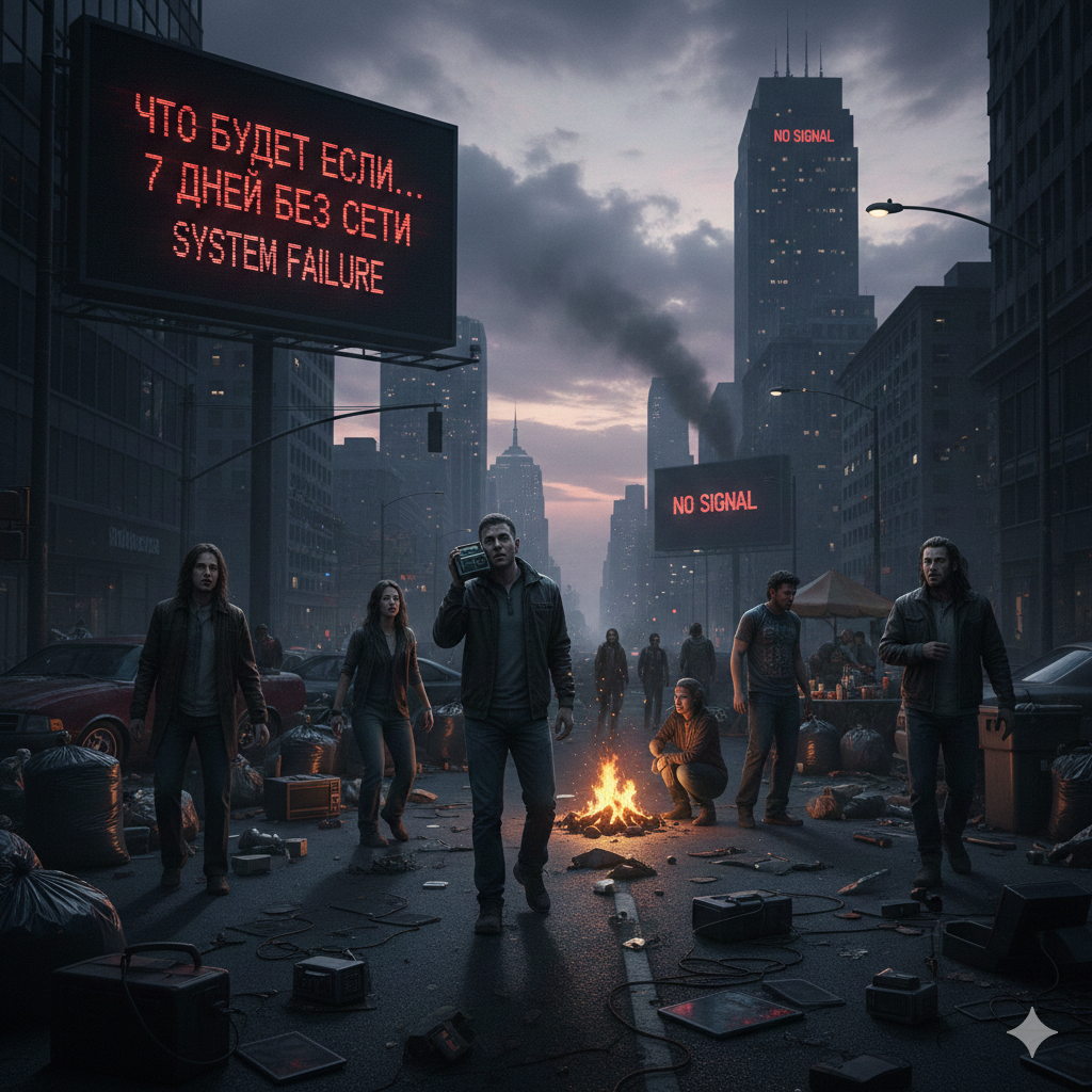 Мир просыпается в полной тишине. Не той тишине, что бывает за городом, а той, что наступает, когда из жизни вырывают её сердцебиение. Утро вторника. Ни ленты новостей, ни привычного "пилика" сообщений. Сначала — недоумение. Люди проверяют роутеры, перезагружают телефоны. Улыбаются соседям в лифте: "У вас тоже не работает?" Но к обеду вторника паника начинает просачиваться сквозь швы цифровой зависимости. Первые 24 часа: Хаос. Банки замирают, потому что деньги в современном мире – это информация. Терминалы не работают, банкоматы плюются ошибками. Аэропорты превращаются в отстойники нервных пассажиров, чьи рейсы отменены без возможности оповещения. Биржи рушатся с грохотом, которого никто не слышит. Службы спасения перегружены вызовами, но их внутренняя связь тоже даёт сбои. Мир узнаёт, что он держится на тончайших нитях оптоволокна. День третий: Голод и информационный вакуум. Логистика, завязанная на онлайн-трекинге и GPS, парализована. Грузовики стоят. Еда не доезжает до магазинов. А