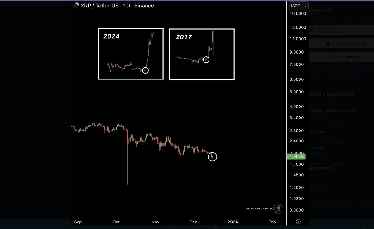 📉 XRP торгуется около $1.87, опустившись ниже отметки $2, и снизился примерно на 30% в четвертом квартале 2025 года. Тем не менее, некоторые аналитики видят в текущей слабости часть более крупной фазы накопления, которая ранее предшествовала сильным ралли. 📊 Ключевые моменты: - XRP демонстрировал схожие фазы накопления в прошлых циклах, за которыми следовали значительные подъемы (например, с $0.005 до $3.30 в 2018 году и с $0.50 до $3.4 в 2025 году). - Текущий диапазон $1.8–$2 может выступать в качестве нового уровня поддержки. - Среди потенциальных катализаторов роста — возможное завершение дела SEC, появление ETF, ориентированных на XRP, и принятие Закона о ясности. - Некоторые называют это ралли "самым ненавистным", так как оно может начаться на фоне всеобщего скептицизма.