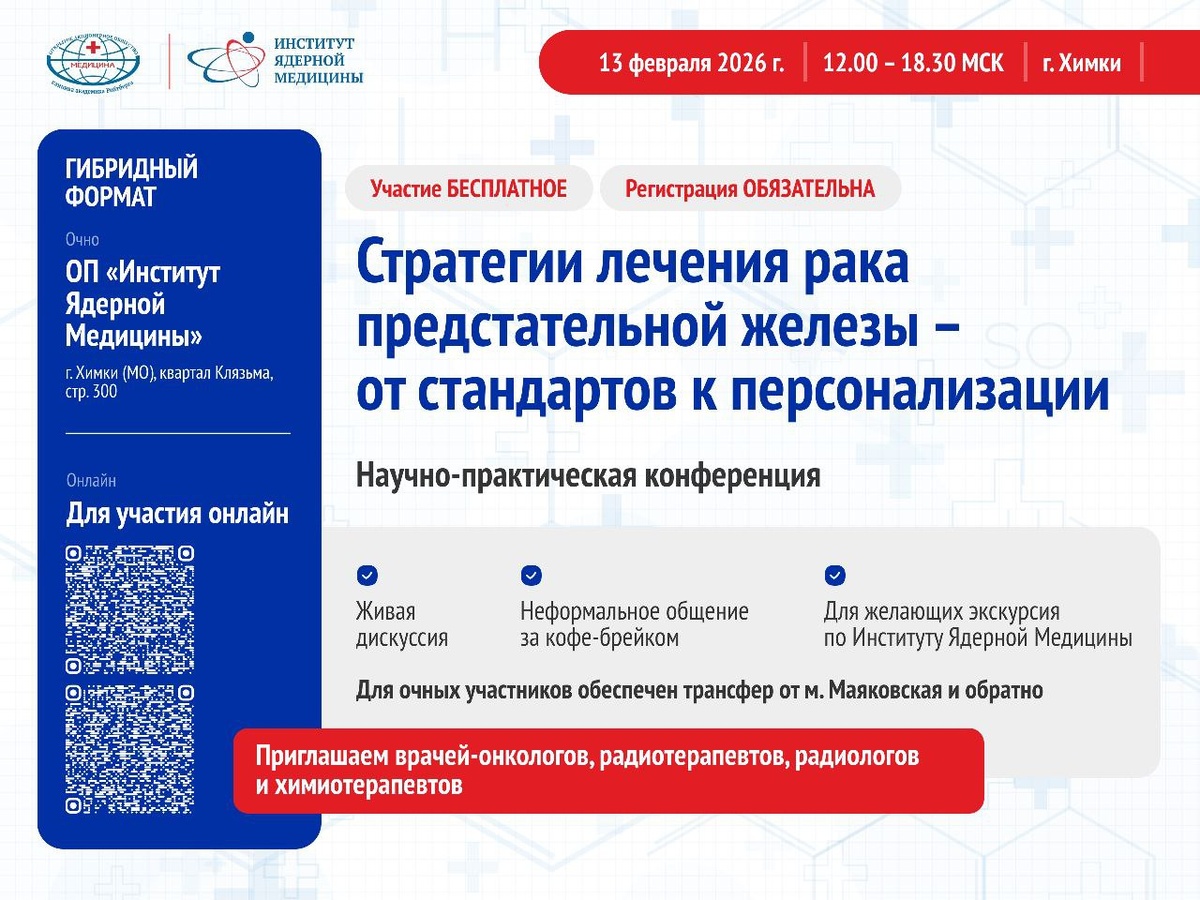 📅 Когда: 13 февраля 2026 года ⏰ Время: 12.00 – 18.30 💻 Формат: очно/онлайн Место проведения: ОП «Институт Ядерной Медицины», г. Химки, квартал Клязьма, стр. 300 Для очных участников обеспечен трансфер от м. Маяковская и обратно • «Лучевая диагностика рака предстательной железы: возможности и практическое применение" Мищенко Андрей Владимирович, д.м.н., доцент, главный врач ОП «Институт Ядерной Медицины» Химки, АО «Медицина». • «Повышение эффективности радиотерапии: персонализированное лечение рака предстательной железы на основе новых технологий визуализации» Кирюшкина Диана Тимофеевна, старший медицинский физик отделения радиотерапии ОП «Институт Ядерной Медицины» Химки, АО «Медицина». • «Сочетанная лучевая терапия при раке предстательной железы» Макарова Ксения Сергеевна, врач-радиотерапевт отделения радиотерапии МРНЦ им. А.Ф. Цыба - филиала ФГБУ "НМИЦ радиологии" Минздрава России • «Повторная дистанционная лучевая терапия при раке предстательной железы. Обзор литературы и собстве