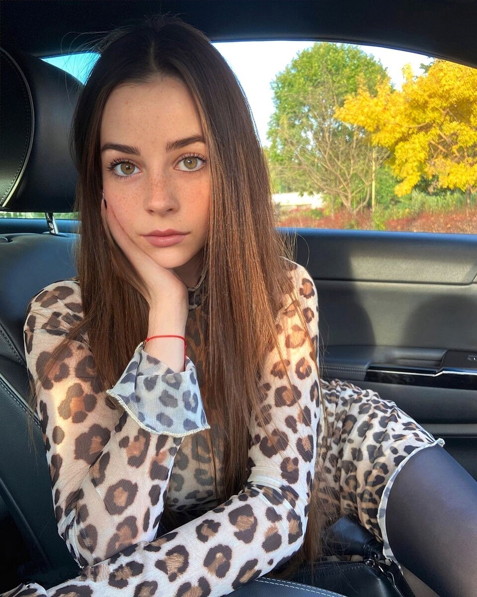 В мягком полумраке салона автомобиля, словно в уютной раме, сидит девушка — воплощение задумчивой грации. Её длинные, шелковистые волосы ниспадают по плечам, обрамляя лицо, будто нарисованное тонкими мазками света: веснушки играют на коже, как россыпь золотых искорок, а глаза, полные глубины и лёгкой меланхолии, смотрят прямо в душу.