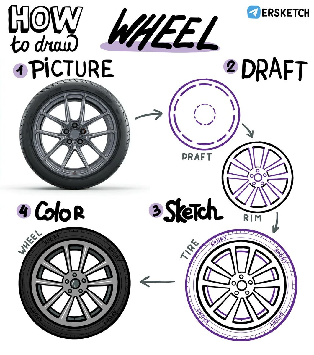 Колесо — это сложно устроенная штука. Там есть диск, есть покрышка, крепление, еще может быть камера внутри. Но при этом рисовать его довольно просто. Надо начать с диска, в котором разметить линии внутреннего и внешнего обода. Потом соединить это спицами, добавить в середине круги крепления. И снаружи нарисовать шину. В шине можно сделать рисунок протектора и надписи, чтобы она смотрелась интереснее. 52 HIT C-C-COMBO!!! 🎄