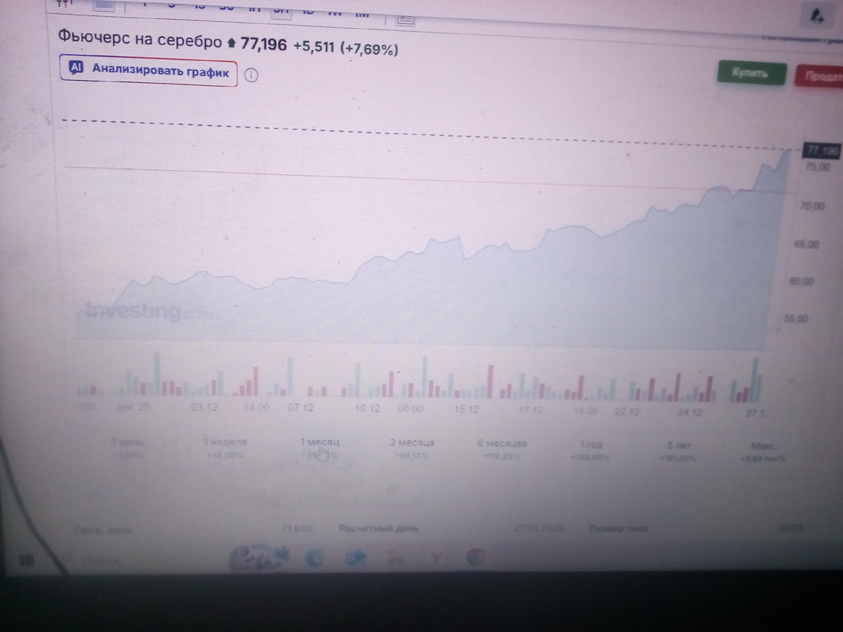 Мне тут кое кто (не буду показывать пальцем) выкатил претензии, что я советовал покупать серебро. А теперь отказываюсь от своих слов... Спокойно, Марья-Лиза! Я когда говорил-то? Месяц назад??? Так с той поры серебро уже улетело в полтора раза!!!! (примерно с 50 до 75) Я вам что, пророк? График должен нарисовать, как цены поведут себя? Да, месяц назад я сказал, что надо купить до Нового Года... И чо? Ко мне какие претензии? Я что, сказал, что надо ждать Нового Года?! :0((