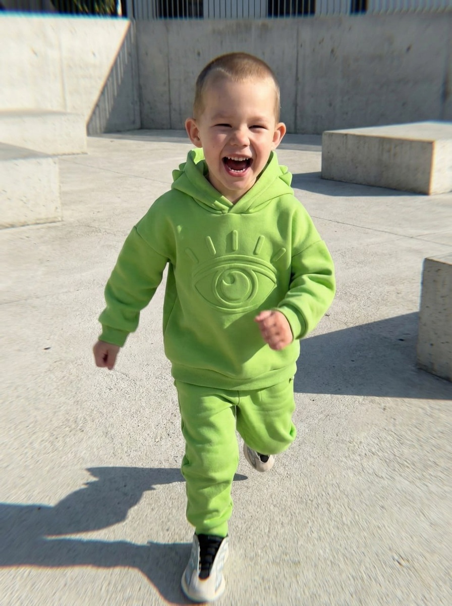 🔠🔠🔠🔠🔠🔠🔠⭐️ Промт из серии "Корпорация монстров" 2/9 Промт адоптирован для мальчика 5 лет, меняем цифру на нужную и меняем BOY на GIRL 👉Генерирую тут A high-energy candid shot of a 5-year-old boy sprinting towards the camera on a minimalist concrete playground, caught in slight motion blur to convey speed. He is laughing uncontrollably, dressed in a futuristic bright lime-green neoprene oversized hoodie with a stylized single eye graphic embossed on the chest. The hood has small structured bumps. He wears matching joggers and sleek sneakers. Fisheye lens effect to exaggerate the playful perspective. Vibrant colors, harsh sunlight, energetic atmosphere. --ar 3:4 Заказать промт или фотосессию. ✉️ Буст канала. ⚡️ #нейросеть #aiфотосессия #промтыдляфотографа