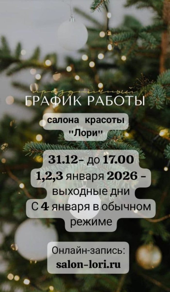 ! В предпраздничные🌟✨ и праздничные🌟✨ дни мы работаем: 31.12.2025 до 17.00 1,2,3 января выходные С 4 января в обычном режиме Онлайн-запись 24/7: salon-lori.ru ------------------------------------------ С заботой о вашей красоте и здоровье, ваш LORI🩶 6-я Парковая, 9 +79266623832