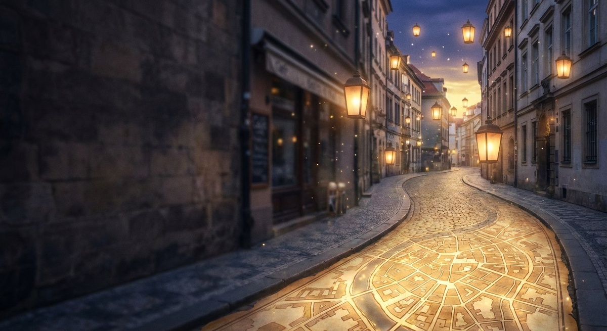 Вечер. Фонари рассыпают полумрак по мокрой брусчатке, а обычная лавочка у дома №12 вдруг начинает мерцать. Линии тротуара расходятся и сходятся не по законам архитектуры, а по условным обозначениям: стрелки, точки и тонкие золотые дорожки проступают на асфальте, подсвечивая маршруты, которые не всегда ведут домой. Это не просто улица — это живая карта, которая шепчет, предлагает пути и требует