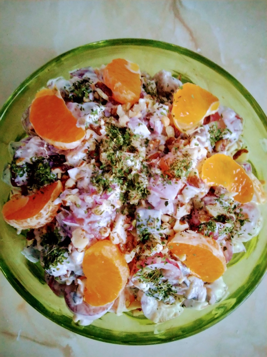 Сложить салат в салатницу , украсить дольками мандарина , рублеными орехами и рубленой зеленью
