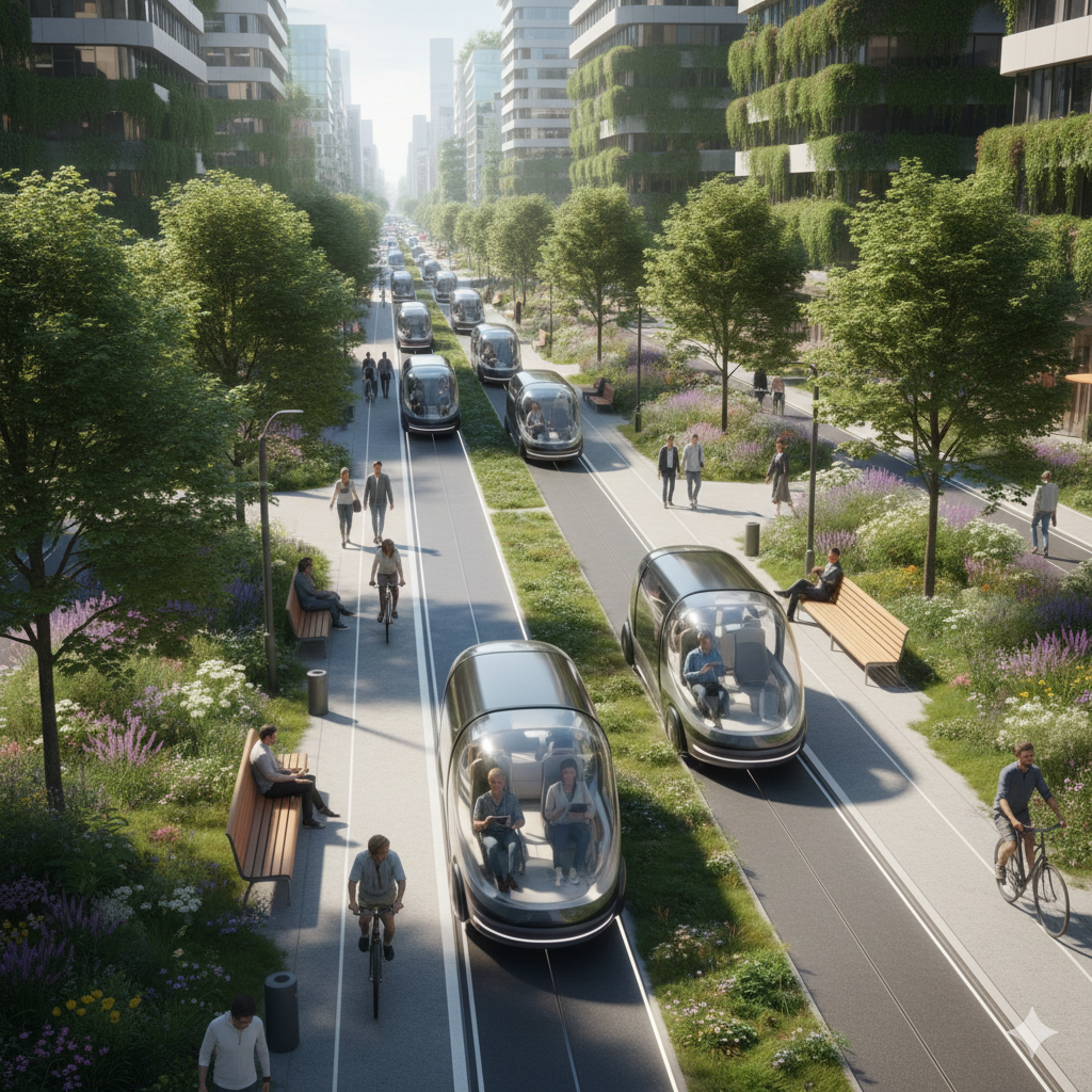 Представь: 2035 год. В городах запрещено водить машину вручную. Руль и педали стали пережитком прошлого, как каретные хлысты. Все передвижения контролирует единая городская сеть. Первые 5 лет: Революция пространства. Исчезают пробки — машины общаются друг с другом и проезжают перекрестки на скорости, не задерживаясь. Огромные парковки в центрах городов больше не нужны, ведь машина не стоит «под офисом», а уезжает возить других людей или на окраину. На месте парковок разбивают парки и скверы. 10 лет спустя: Смена образа жизни. Понятие «личный автомобиль» уходит. Ты вызываешь капсулу через приложение, и она приезжает через 2 минуты. Внутри — рабочее место, кровать или даже мини-спортзал. Время в пути теперь не «потерянное время», а полноценная часть жизни. Логистика становится почти бесплатной, доставка товаров происходит мгновенно. 20 лет спустя: Безопасность и архитектура. Смертность в ДТП падает практически до нуля (исключая технические сбои). Города перестраиваются: дороги становятс