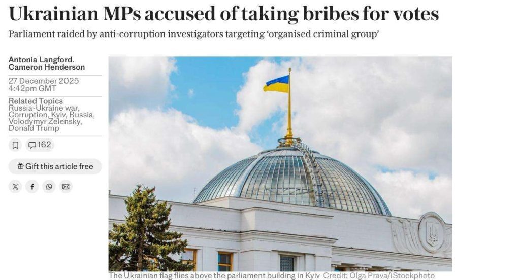 НАБУ заподозрило депутатов Верховной рады в получении взяток за голосования — это стало новым ударом по позициям Зеленского, пишет The Telegraph. По данным издания, расследование связано с масштабной схемой на фоне энергетического скандала почти на $100 млн и из-за которой убрали Ермака. Следствие утверждает, что речь идёт не о единичных эпизодах, а о более широкой коррупционной сети, имена организаторов пока не раскрываются. В The Telegraph отмечают: обыски и новые обвинения могут вызвать резонанс в украинском обществе и ещё сильнее подорвать позиции Зеленского. Особенно в момент, когда он пытается заручиться поддержкой США по ключевым вопросам, включая Донбасс.
