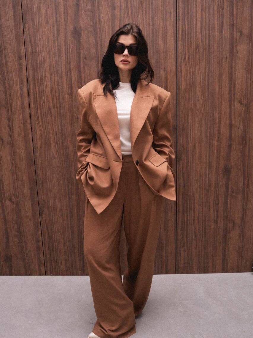 Однобортный жакет прямого силуэта с объемными подплечниками и фиксацией на массивную одинарную пуговицу