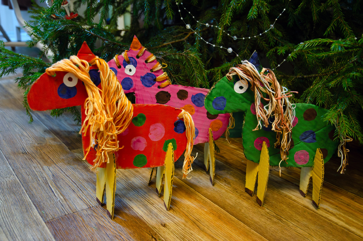 Каждый год я стараюсь сделать со старшенькой какую-нибудь несложную поделку в качестве новогоднего сувенира для наших родственников. В прошлый раз мы раскрашивали шишечки и собирали из них букет, а в позапрошлый клеили аппликацию-елочку. В этот раз полет моей фантазии был подбит нехваткой времени и какой-то нереальной суетой, до последнего я не была уверена, что мы вообще что-то сделаем. И вот на днях после очередного приступа шопоголизма, разбирая кучу картонных коробок, я внезапно подумала, что они отлично подойдут для лошадок-символов года.