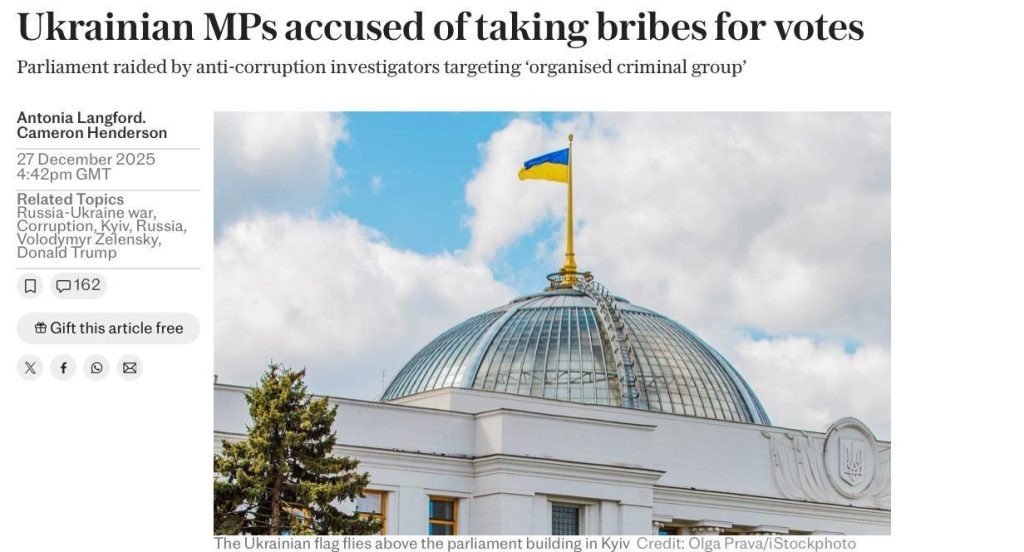 НАБУ заподозрило депутатов Верховной рады в получении взяток за голосования — это стало новым ударом по позициям Зеленского, пишет The Telegraph. По данным издания, расследование связано с масштабной схемой на фоне энергетического скандала почти на $100 млн и из-за которой убрали Ермака. Следствие утверждает, что речь идёт не о единичных эпизодах, а о более широкой коррупционной сети, имена организаторов пока не раскрываются. В The Telegraph отмечают: обыски и новые обвинения могут вызвать резонанс в украинском обществе и ещё сильнее подорвать позиции Зеленского. Особенно в момент, когда он пытается заручиться поддержкой США по ключевым вопросам, включая Донбасс. Ранее глава МИД России Сергей Лавров заявил, что режим Зеленского не демонстрирует никакой готовности к конструктивному диалогу, несмотря на разговоры о мире и переговорах.