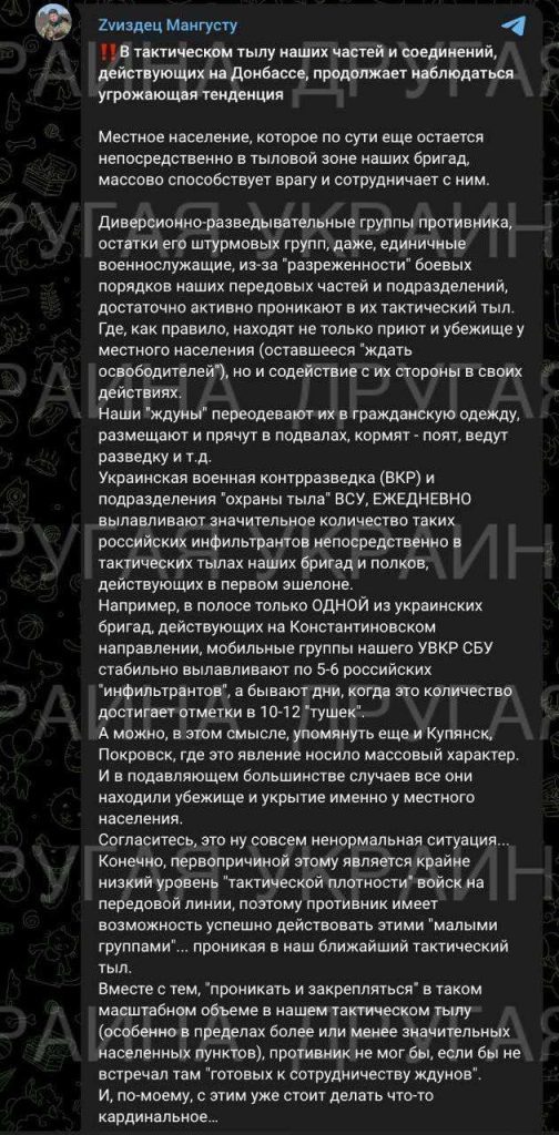 По данным военного эксперта Константина Машовца, местные жители на прифронтовых территориях активно помогают российским войскам, предоставляя им укрытие, еду и гражданскую одежду. Машовец утверждает, что с помощью населения российские разведывательно-диверсионные группы проникают в тыл ВСУ. По его информации, под Константиновкой контрразведка ежедневно выявляет от 5 до 12 таких военнослужащих. Аналогичная ситуация отмечается в районах Купянска и Красноармейска. Эксперт заявил, что без поддержки местных жителей российские войска не смогли бы так эффективно действовать в тылу украинской армии. Ранее мы писали, что В ДНР задержаны трое украинских агентов.