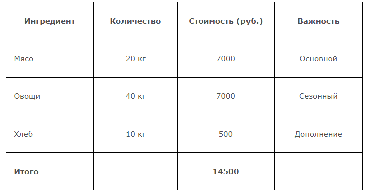 Таблица 1. Расчет себестоимости (пример для 100 порций)