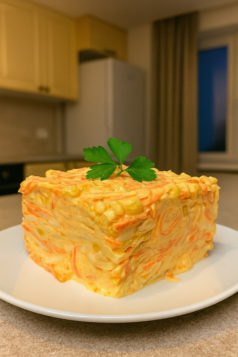 3. В глубокой миске соедините натёртые яйца, сыр, кукурузу (без жидкости) и морковь по-корейски.