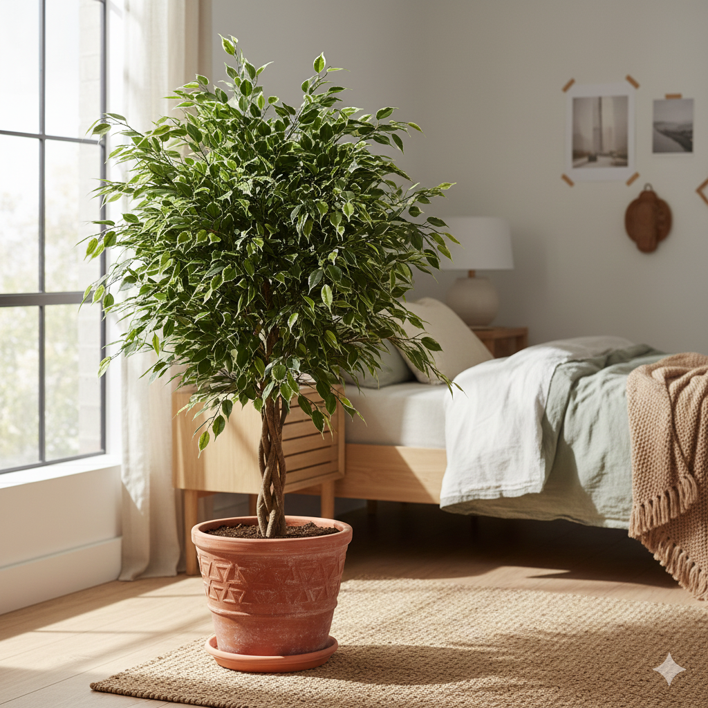 Фикус бенджамина — это капризный, но бесконечно элегантный аристократ. Он напоминает тонкое кружево или застывший зеленый фонтан. Среди всех комнатных растений именно он обладает самым «драматичным» характером: он может быть вашим лучшим другом, а может устроить настоящий листопад в ответ на малейшую обиду. Сейчас, когда в моде естественность и «дикие» сады внутри квартир, фикус бенджамина переживает новый виток популярности. Ведь никто другой не умеет так изящно имитировать настоящий лес в миниатюре. Своё имя он получил вовсе не в честь какого-то конкретного Бенджамина. Ботаники до сих пор спорят: то ли это искаженное «ben-jay» (индийское название смолы), то ли отсылка к «бензойной смоле». Как бы там ни было, его второе имя — «плакучий инжир» (Weeping Fig) — идеально описывает его поникшие, грациозные ветви. В дикой природе (Индия, Китай, Австралия) это дерево-исполин, достигающее 25 метров. Его крона настолько густая, что под ней может спрятаться целая деревня от солнца. В квартирах